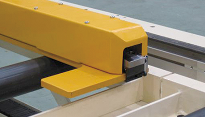 - Flat bars and angles are pushed and clamped by the carriage