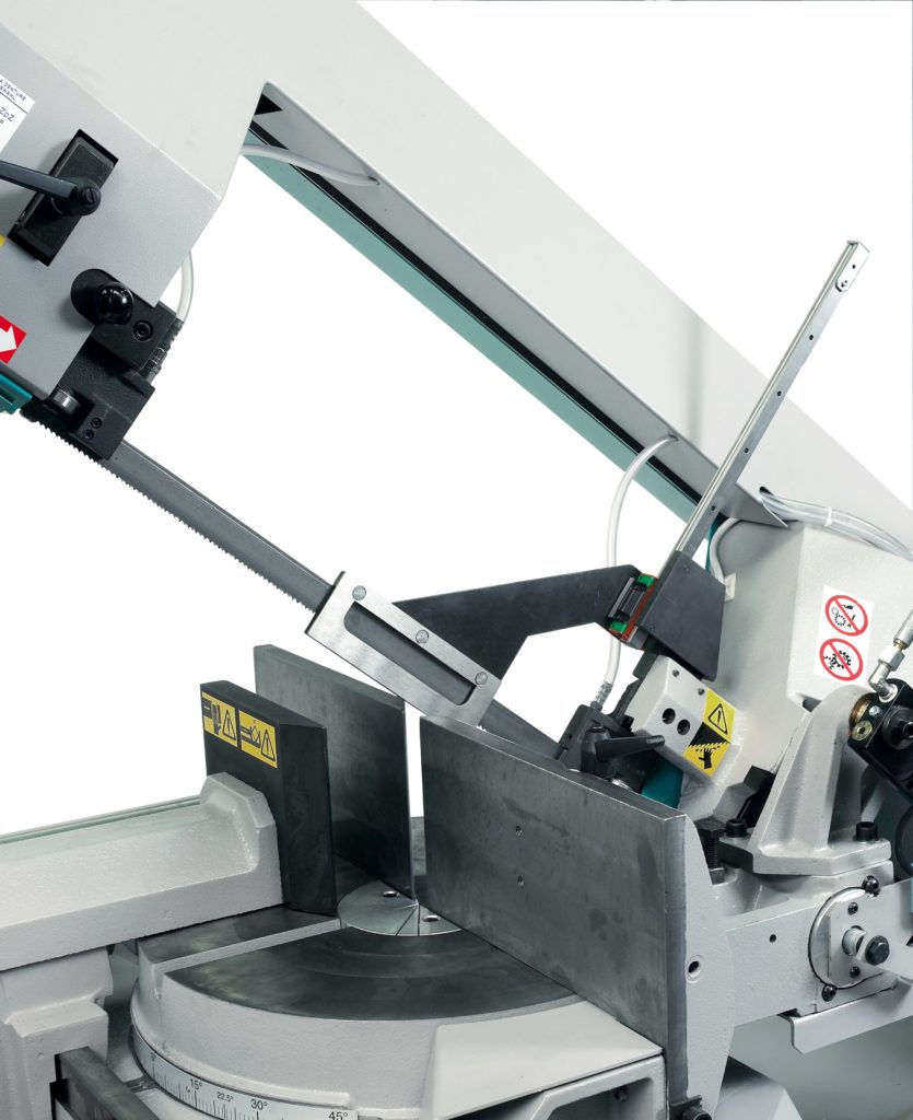• Easy stops at 0°, 45°, 60° left and 45° right. Adjustment of the blade tension from the front side of the saw-frame, checked by an end-stroke. Blade guides with hard metal pads, additional bearing for blade alignment.